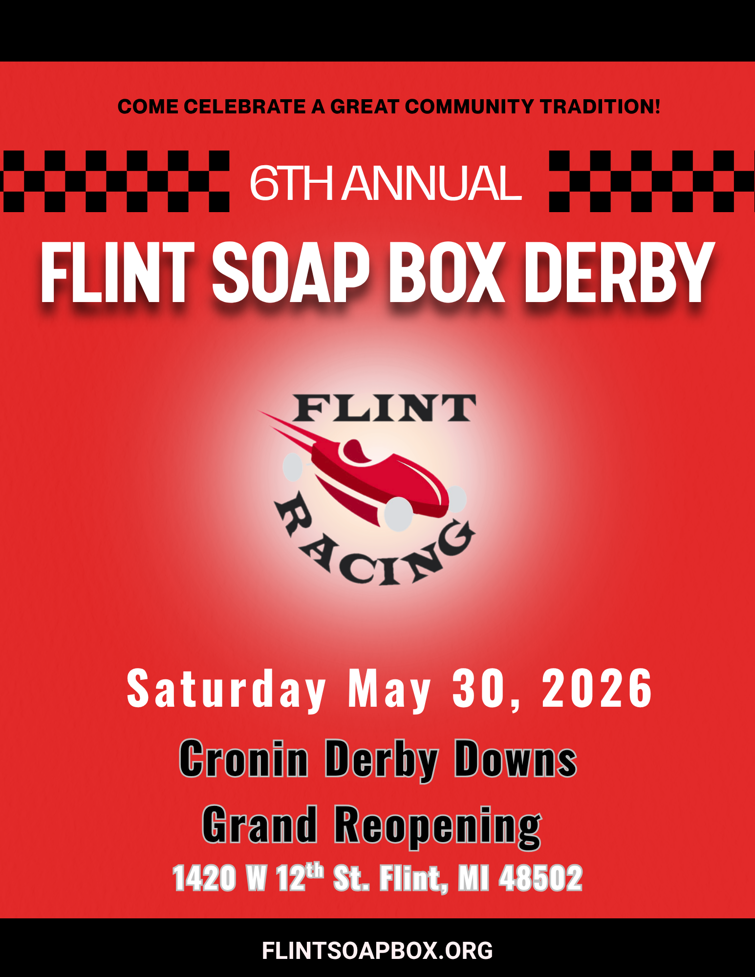Registration for the 2025 Flint Soap Box Derby will open this Spring . Please sign up to receive the latest information on future events in 2025 and 2026!